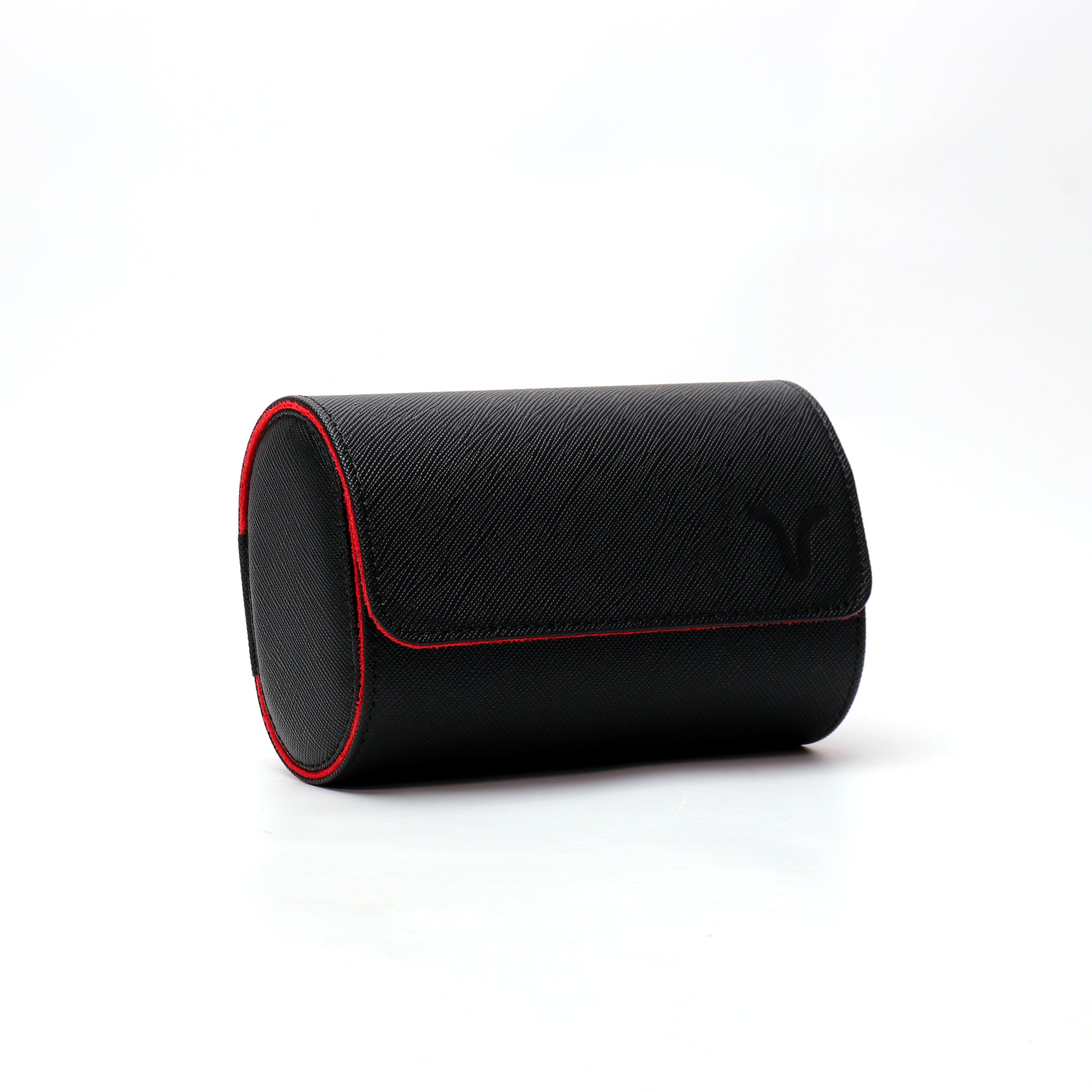 Watch roll in Black Saffiano leather exterior with red suede interior. Designed to hold and protect two timepieces.